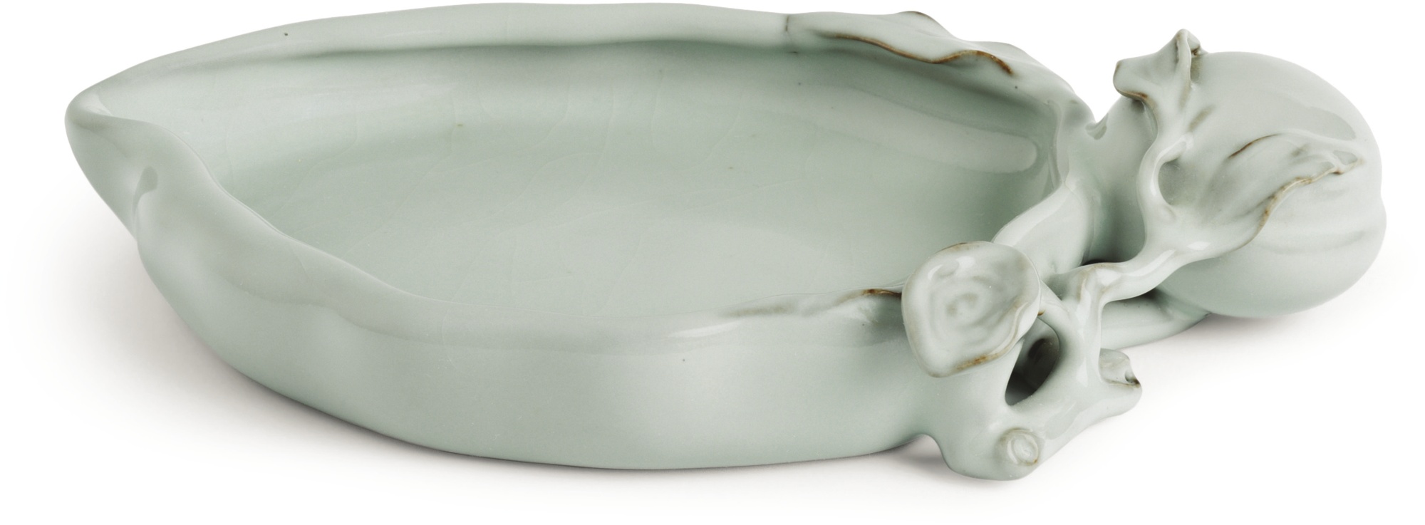 the asymmetrical shallow bowl forming the outline of a peach with unevenly furled sides, the handle formed from a gnarled tree branch set with a plump peach, a lingzhi and curled leaves, all beneath an opaque milky blue-green glaze with faint crackles, thinning at the edges of the leaves and branches to reveal a dark body, fired on four spurs revealing the porcelain body beneath, the underside modelled with a shallow groove characteristic of peaches, marked on the base with a six-character reign mark in underglaze blue, wood stand