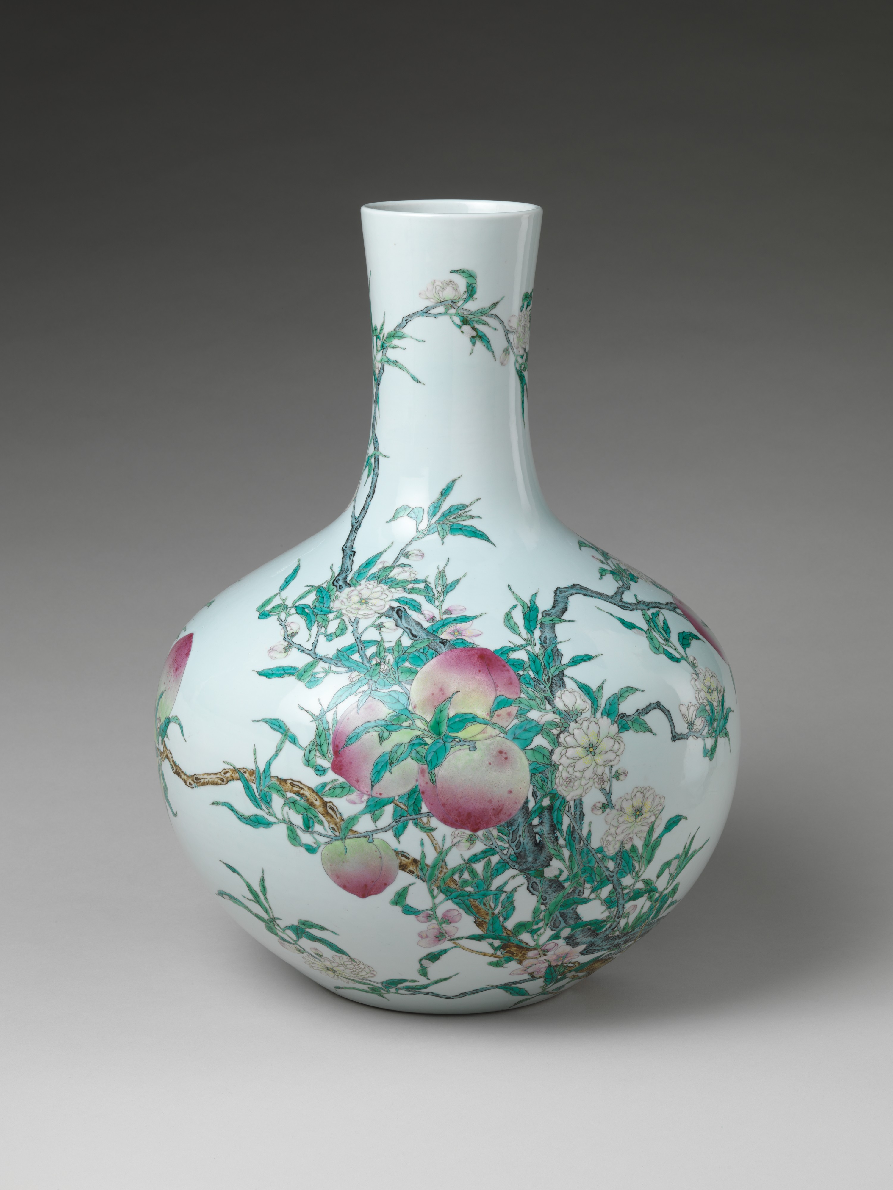 Vase with Nine Peaches. The delicate pink in the painting illustrates the development of new colors in the early part of the eighteenth century. Opaque white derived from a lead arsenite, and pale pink tinted with bits of gold were added to the palette and combined with existing colors to create a range of hues. Qianlong mark. The Met