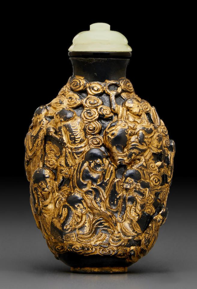 The oval bottle rising to a waisted neck beneath a gilded flat lip, the sides vividly molded in high relief with the Eighteen Luohan in various postures, the formalized cloud scrolls creating a celestial atmosphere; the richly gilt highlight against a black ground, in imitation of gilt bronze; a four-character Qianlong mark painted in gold to the recessed flat foot and surrounded by a neat oval foot ring. Sold for US$ 937 at Bonham’s