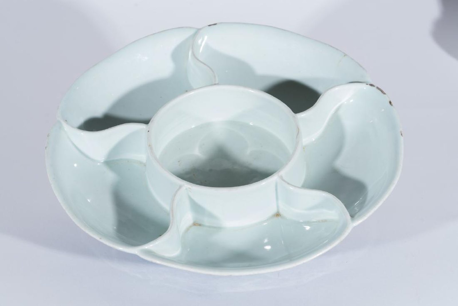 Chinese Art A fine blue and white Ming style porcelain snack dish painted with lotus flowers and leafy scrolls, bearing a six character Qianlong zhuanshu seal mark and of the period . . Cm 32,00 x 6,00. Noteworthy dish characterized by a white interior divided into compartments with a circular central space, surrounded by five sections in the shape of petals, the mold of which is also visible on the exterior. The exterior is finely decorated with lotus flowers among floral shoots with blue underglaze imitating the “heaped and piled” technique. On the base the sigil reads “from Qing Qianlong nian zhi”.Provenance: Venetian private collection, in Italy since the early 20th century.